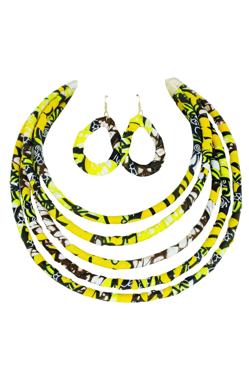 Turn heads with this vibrant African print jewelry set, handcrafted with care and culture in every detail. Featuring a multi-layered fabric-wrapped necklace and matching teardrop earrings, this set showcases a stunning combination of yellow, brown, black, and white tones. The traditional Ankara print adds a bold pop of color and pattern to any outfit—perfect for festivals, cultural events, or adding a statement to your everyday look. Lightweight and comfortable to wear, this set is a beautiful blend of heritage and modern style.100% Cotton