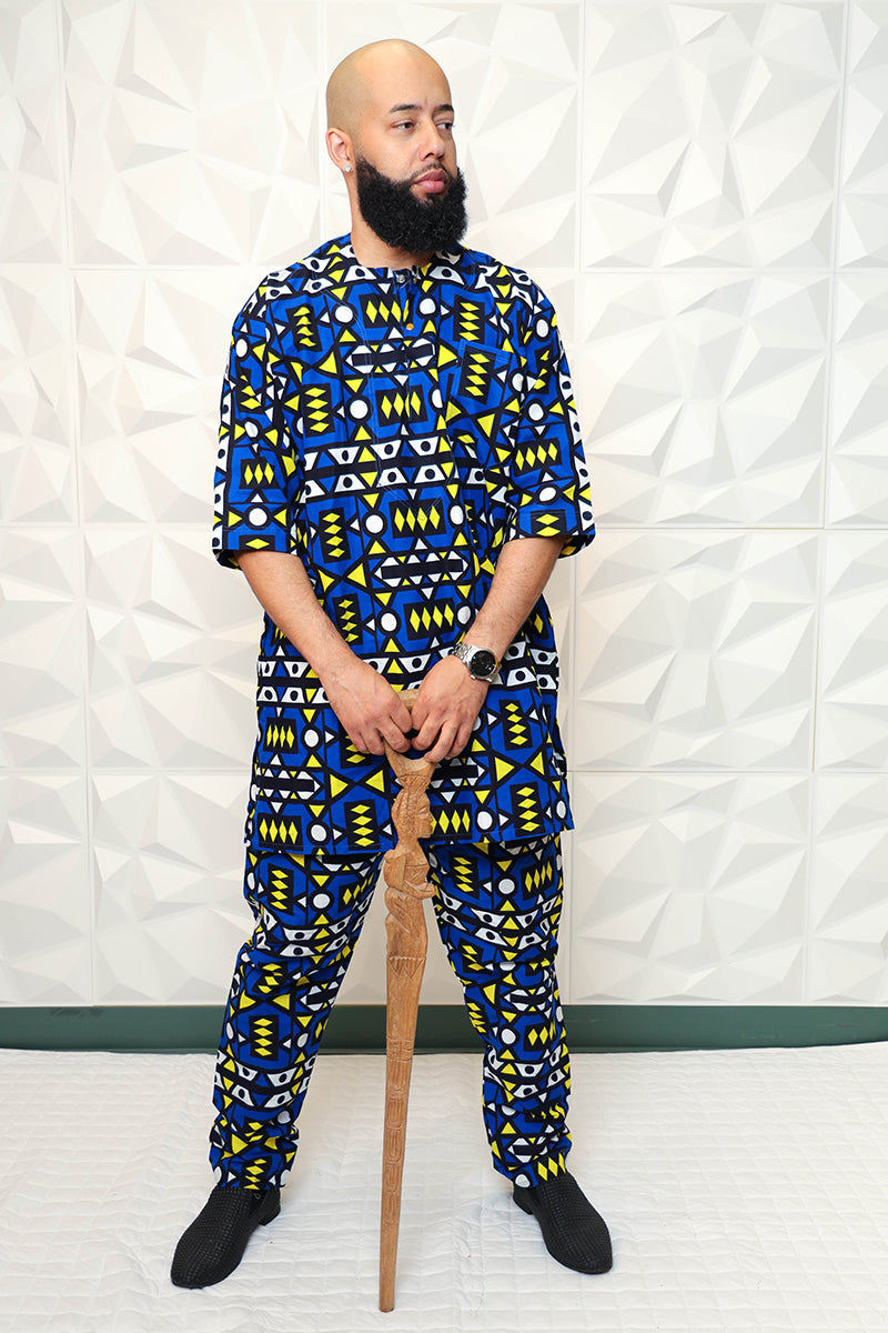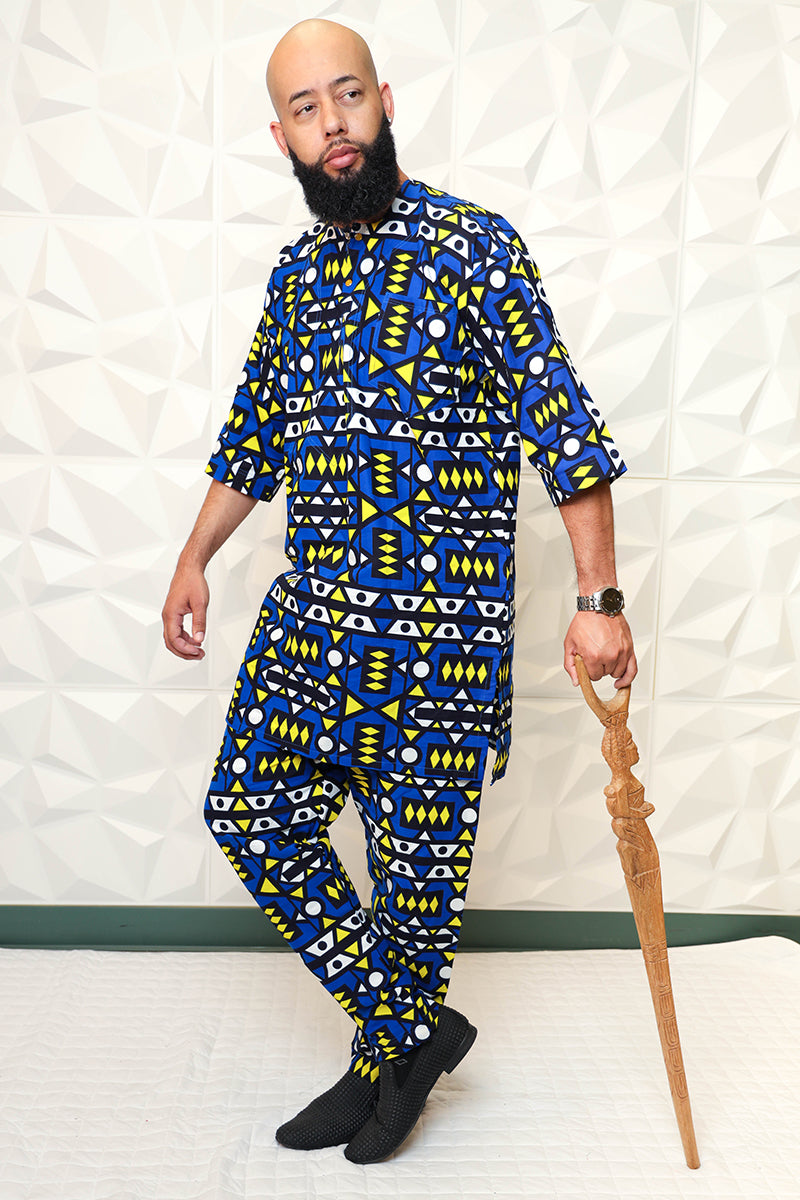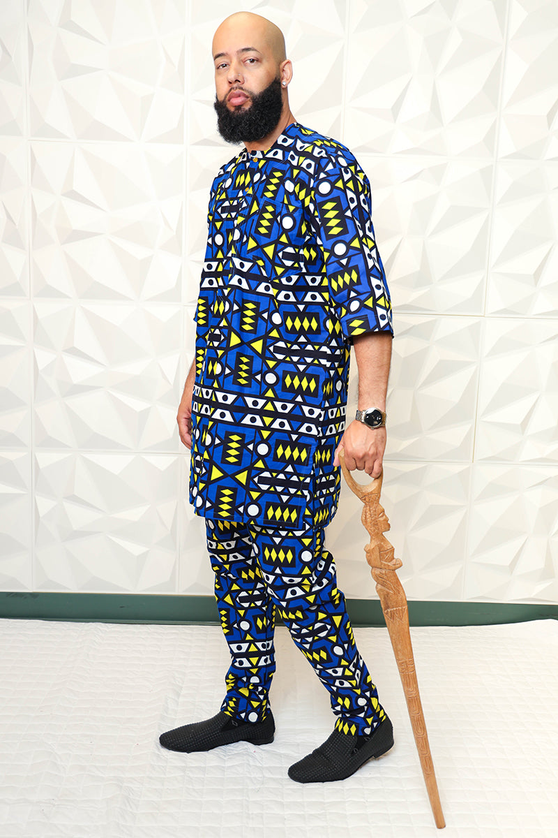 Specially made for a king, rock the Blue Nasir African Print Pant Set. Pair the elegant set with our Knitted Nasia Kaftan Dress, and accessories to complete your regal look. Be prepared to steal the spotlight in this unique African inspired style!